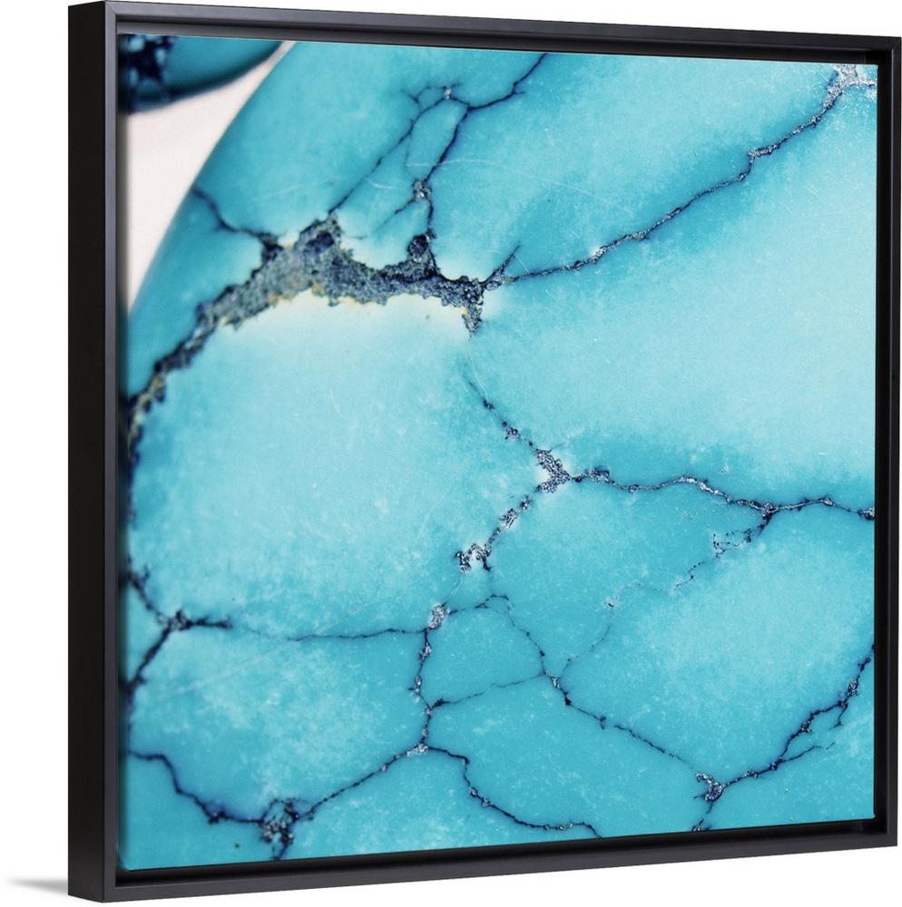 <p>Turquoise gemstone. Close-up of the veins within turquoise (hydrated copper aluminium phosphate), the most valuable non-transparent gemstone. Its name, although now related to its colour, comes from a French word for stone of Turkey. Turquoise gems may include impurities producing other colours, such as green. It has been prized as a gemstone since ancient times, with examples found from 6000 BC.</p>