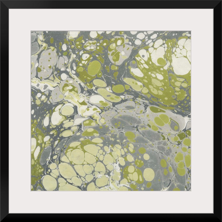 <p>Square abstract artwork of swirls of green, gray and white shades in a marble effect.</p>