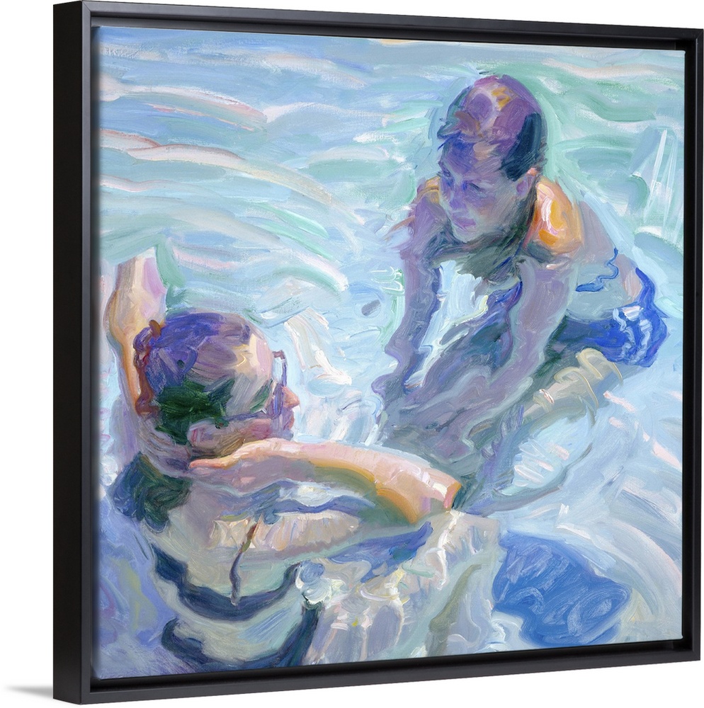 <p>Painting of two young women floating in a pool.</p>