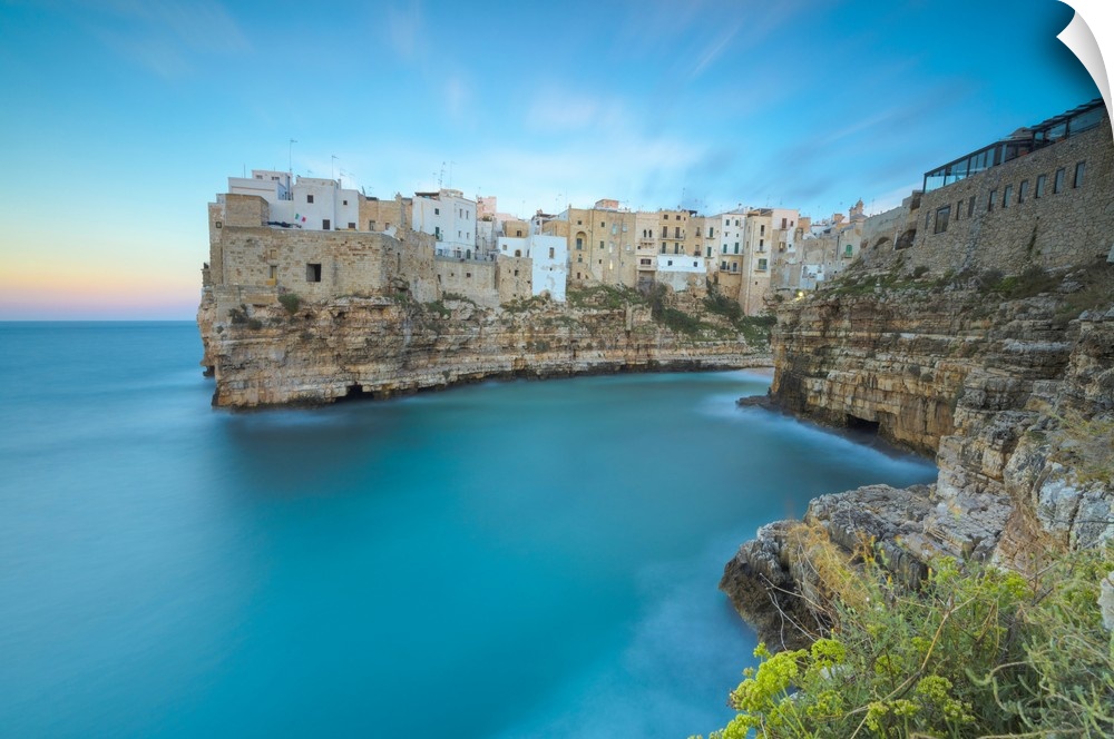 <p>Turquoise sea at sunset framed by the old town perched on the rocks, Polignano a Mare, Province of Bari, Apulia, Italy</p>