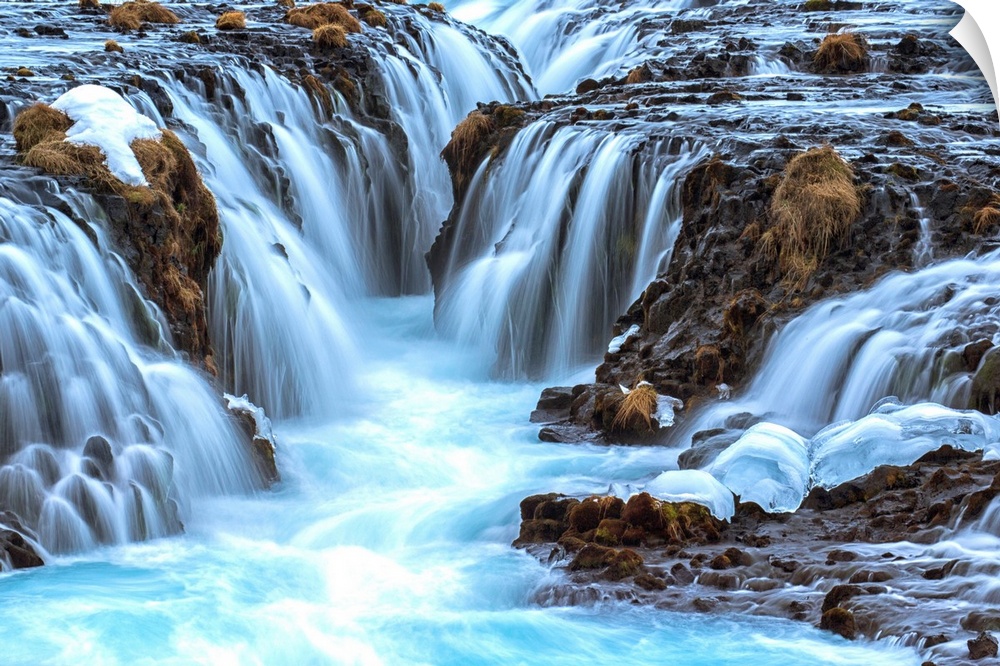 <p>Turquoise water flowing over rocks into a river. Bruarfoss, Iceland.</p>