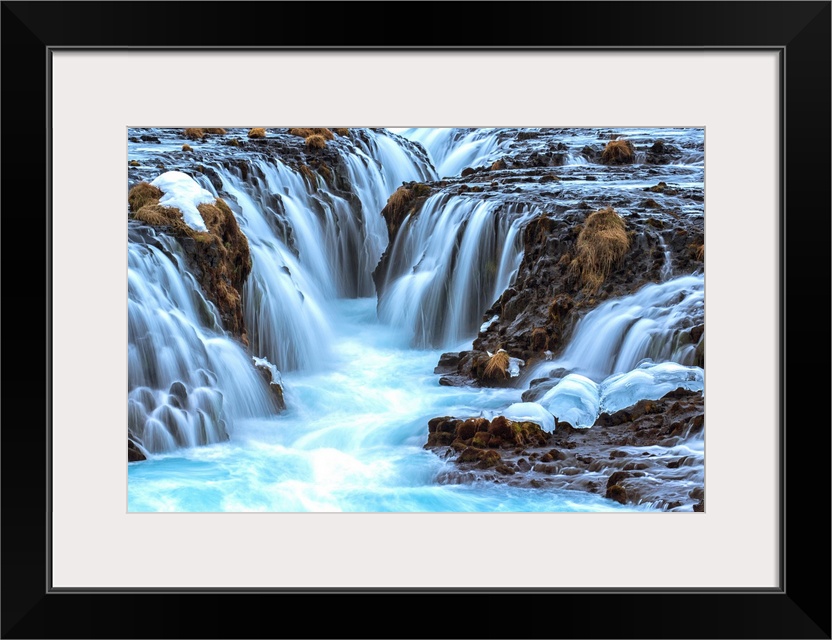 <p>Turquoise water flowing over rocks into a river. Bruarfoss, Iceland.</p>