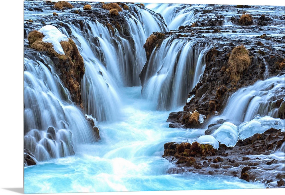 <p>Turquoise water flowing over rocks into a river. Bruarfoss, Iceland.</p>
