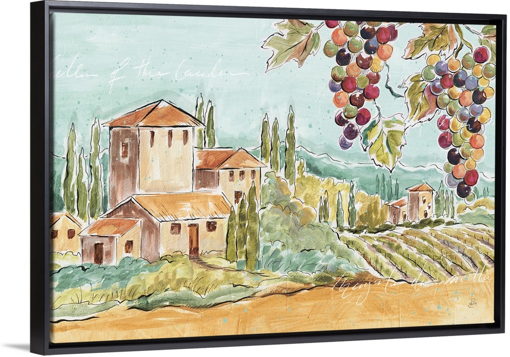 <p>Decorative artwork of a colorful Tuscan landscape and faint text throughout.</p>