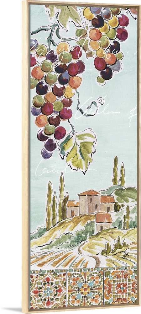 <p>Decorative artwork of a colorful Tuscan landscape with mosaic tile design lining the bottom and faint text throughout.</p>