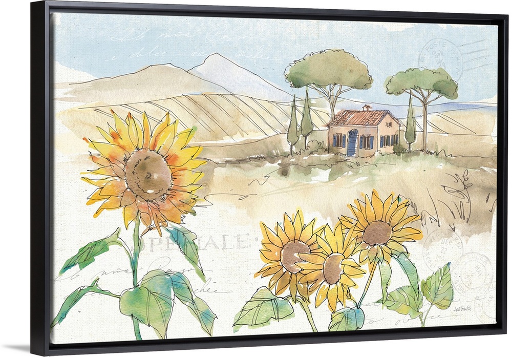 <p>Watercolor painting of a Tuscan landscape with sunflowers in the foreground and a cottage with rolling hills in the background.</p>