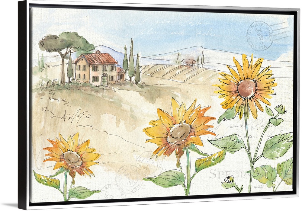 <p>Watercolor painting of a Tuscan landscape with sunflowers in the foreground and a cottage with rolling hills in the background.</p>