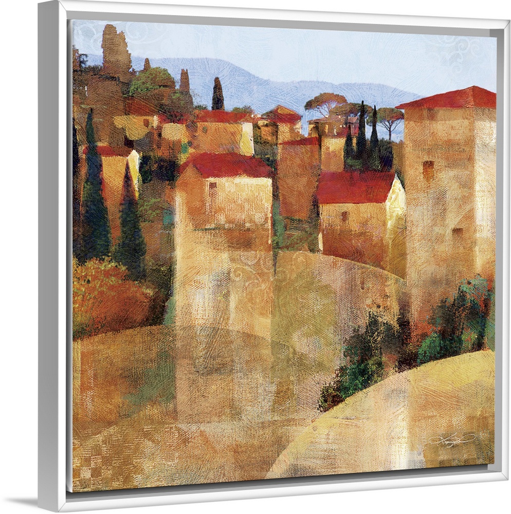 <p>Contemporary artwork of a Tuscan village in the countryside.</p>