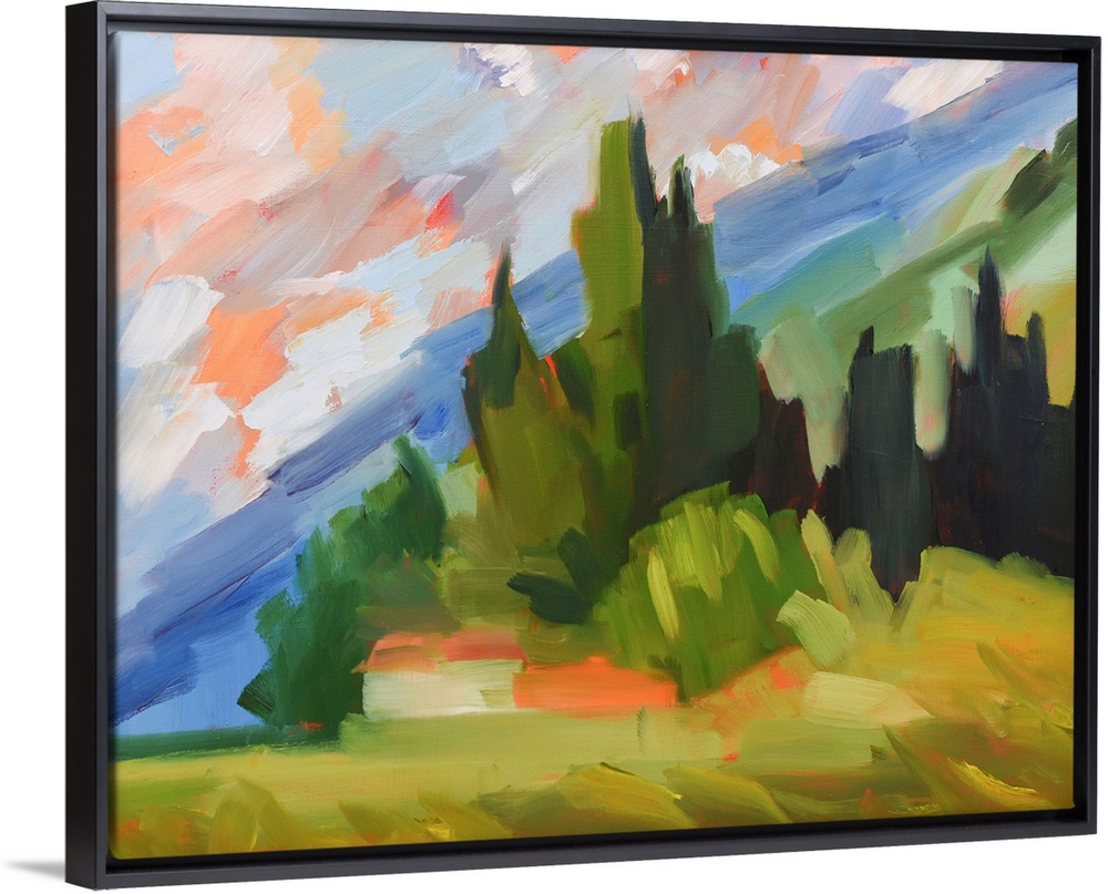 <p>Hillside scene in Tuscany with colorful sky and trees.</p>