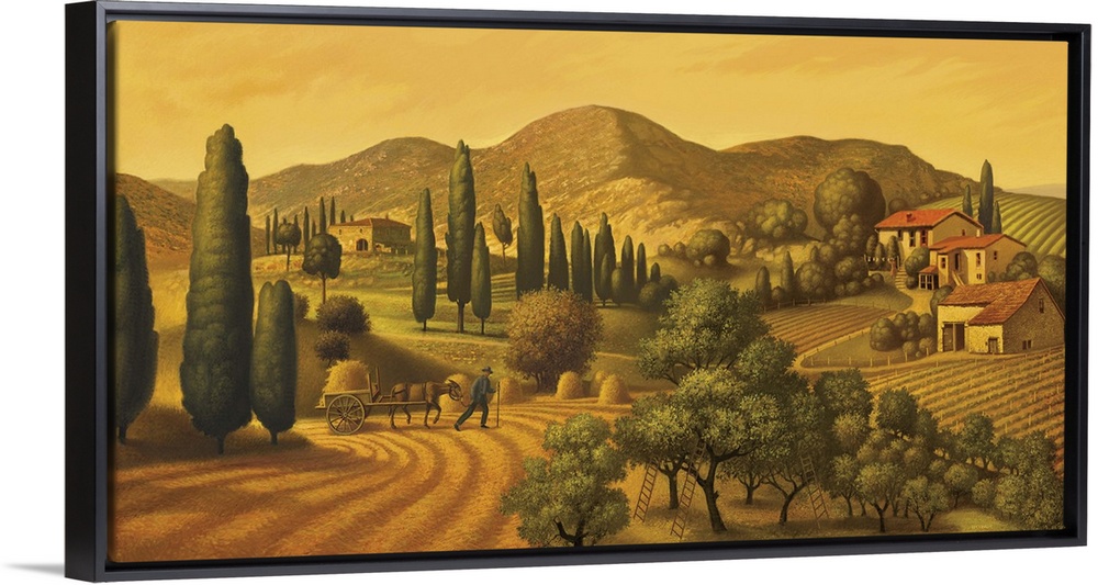 <p>Man with a horse and wagon in the center of a Tuscan hillside.</p>