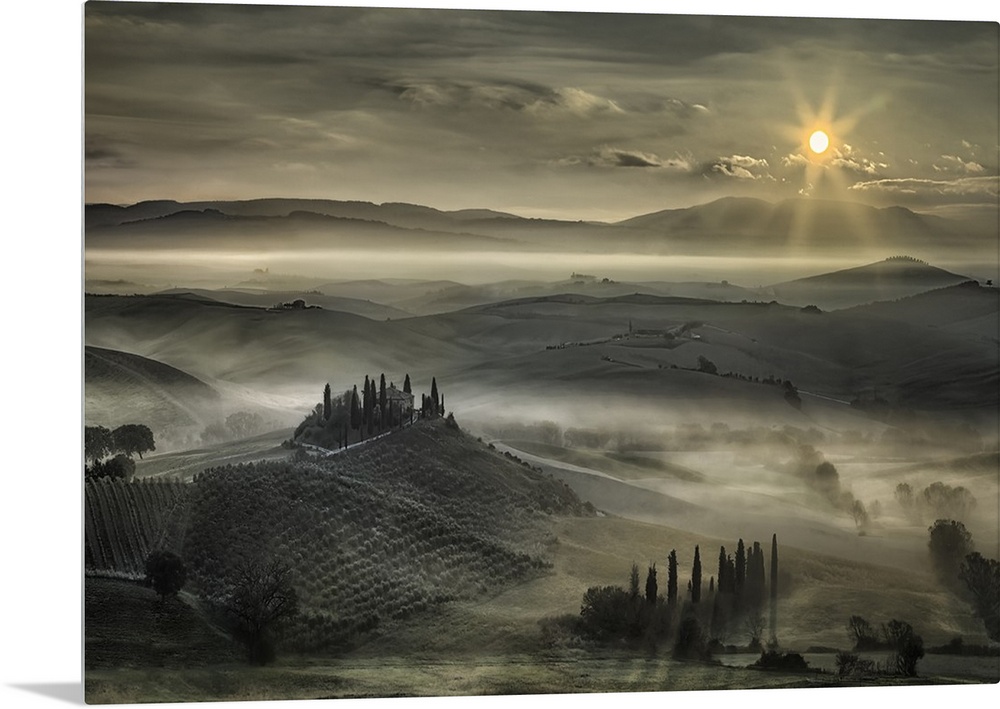 <p>The Tuscan countryside under a blanket of fog on a cloudy morning.</p>