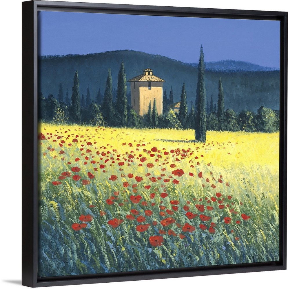<p>Landscape painting of a Tuscan hillside with tall cypress trees.</p>
