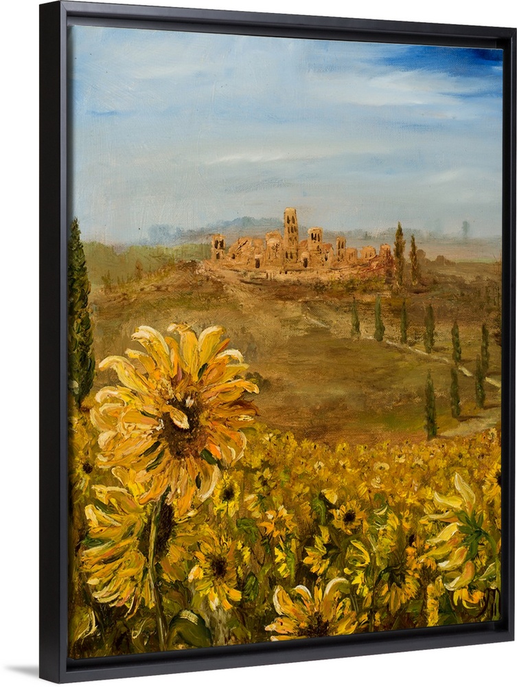 <p>Contemporary landscape painting with sunflowers in the foreground and a Tuscan village in the background.</p>