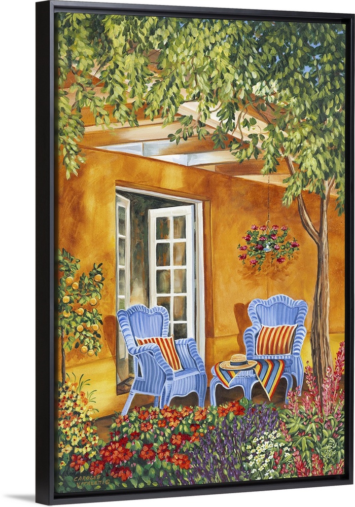 <p>Contemporary painting of a Mediterranean patio with two comfortable chairs and a shady tree.</p>