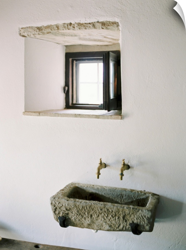 <p>A photograph of a rustic stone wall basin underneath a small window in a white stucco mediterranean dwelling.</p>