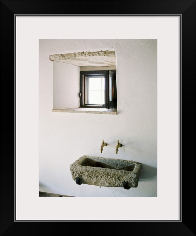 <p>A photograph of a rustic stone wall basin underneath a small window in a white stucco mediterranean dwelling.</p>