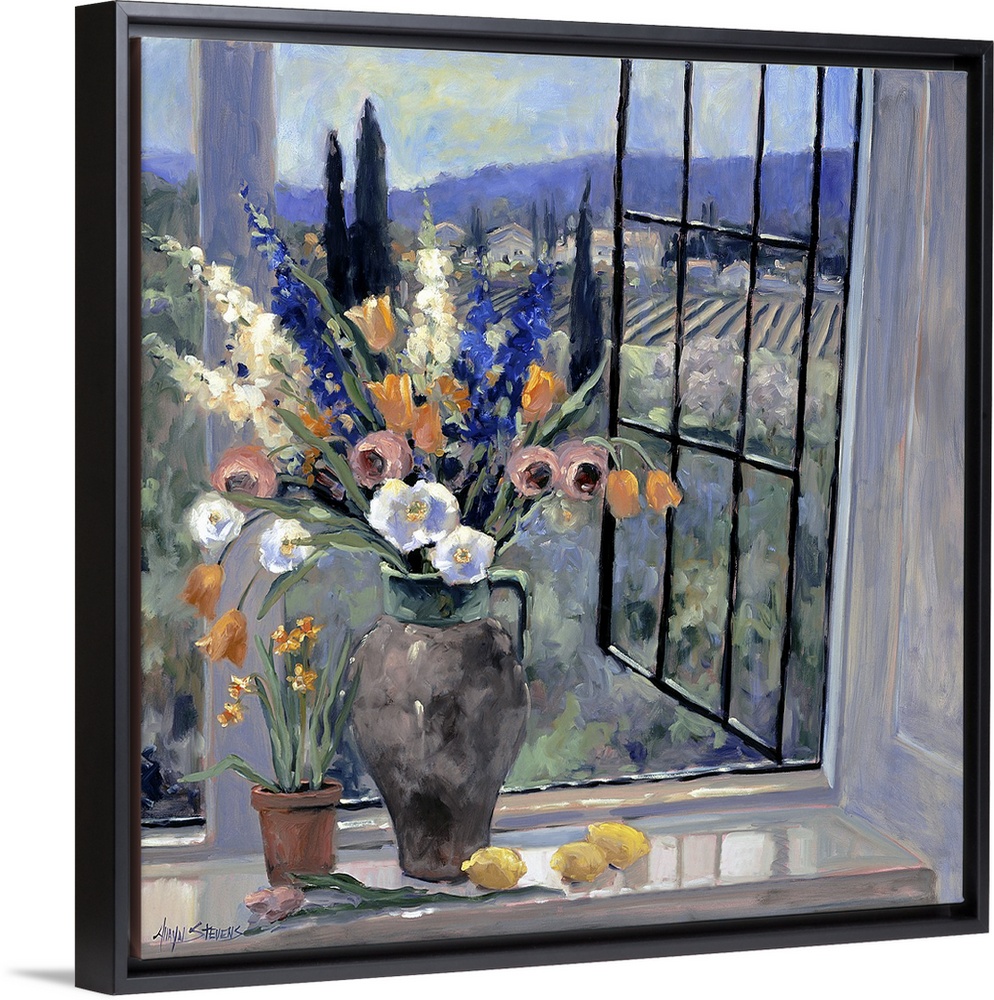 <p>Contemporary landscape painting of a flower filled vase sitting by an open window looking out over the Tuscan hillside.</p>