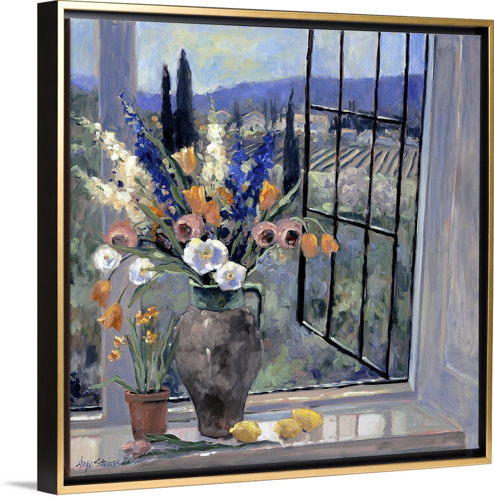 <p>Contemporary landscape painting of a flower filled vase sitting by an open window looking out over the Tuscan hillside.</p>