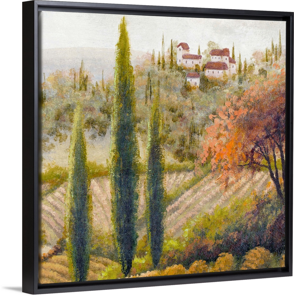 <p>Cypress trees grow between fields of grape vines and Italian villas in the country side of this painted landscape decorative wall accent.</p>