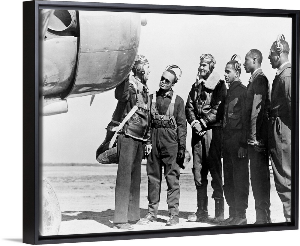 <p>Members of the first group of African American pilots in the history of the U.S. Army Air Corps at Tuskegee, Alabama, with Major General George E. Stratemeyer. Photographed March 1942.</p>