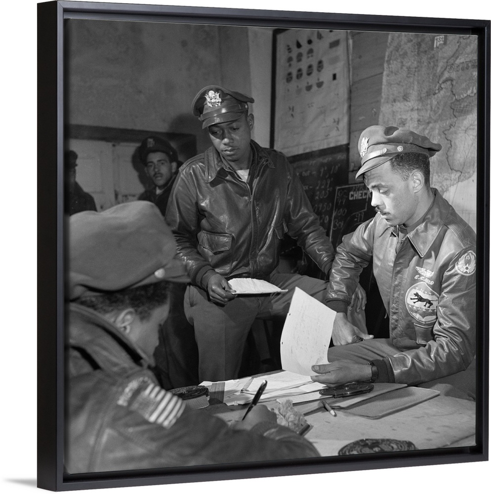 <p>Tuskegee Airmen Woodrow Crockett (standing) with Group Operations Officer Edward Gleed at Ramitelli Airfield in Italy. Photograph by Toni Frissell, March 1945.</p>