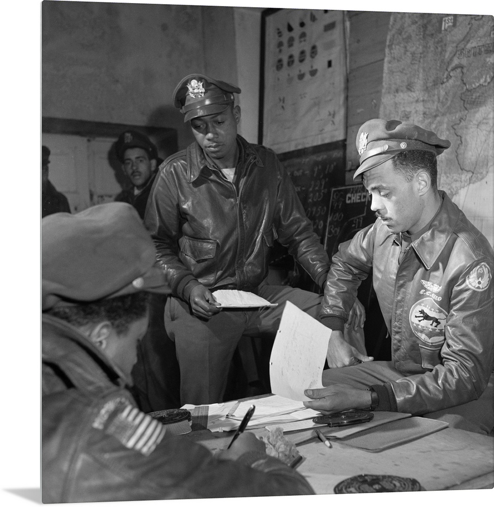 <p>Tuskegee Airmen Woodrow Crockett (standing) with Group Operations Officer Edward Gleed at Ramitelli Airfield in Italy. Photograph by Toni Frissell, March 1945.</p>