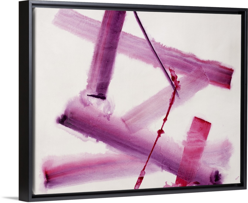 <p>An energetic blend of crossing strokes of pink and purple colors in the center of the artwork.</p>