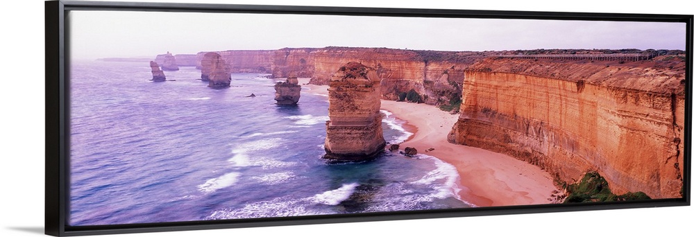 <p>Pano of the Twelve Apostles sticking out of the Tasman Sea as the waves crash on to the sandy shore and the cliffs of shore strech high in to the sky.</p>
