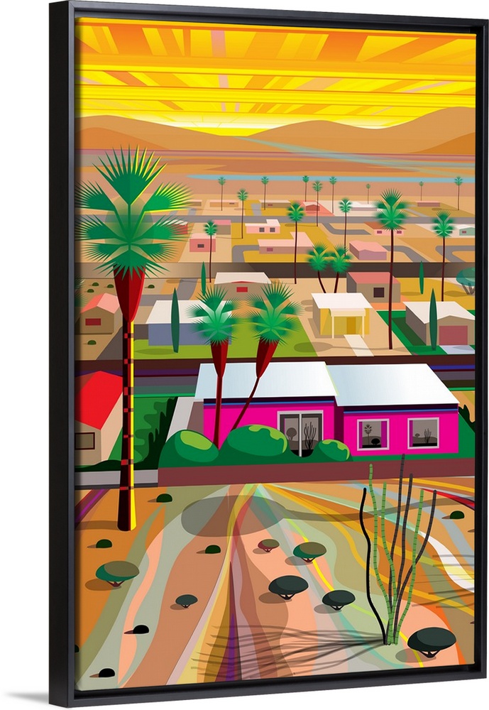 <p>Vertical digital illustration of an Arizona town with homes in the middle of the desert and tall palm trees surrounding.</p>