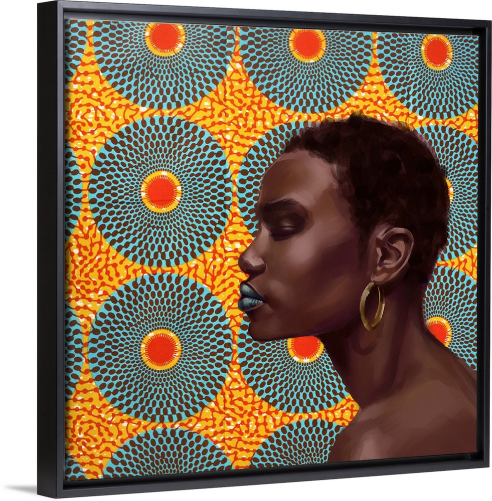 <p>A high impact contemporary portrait of a young Black woman with short hair and large gold hoop earrings in front of a brightly patterned background</p>