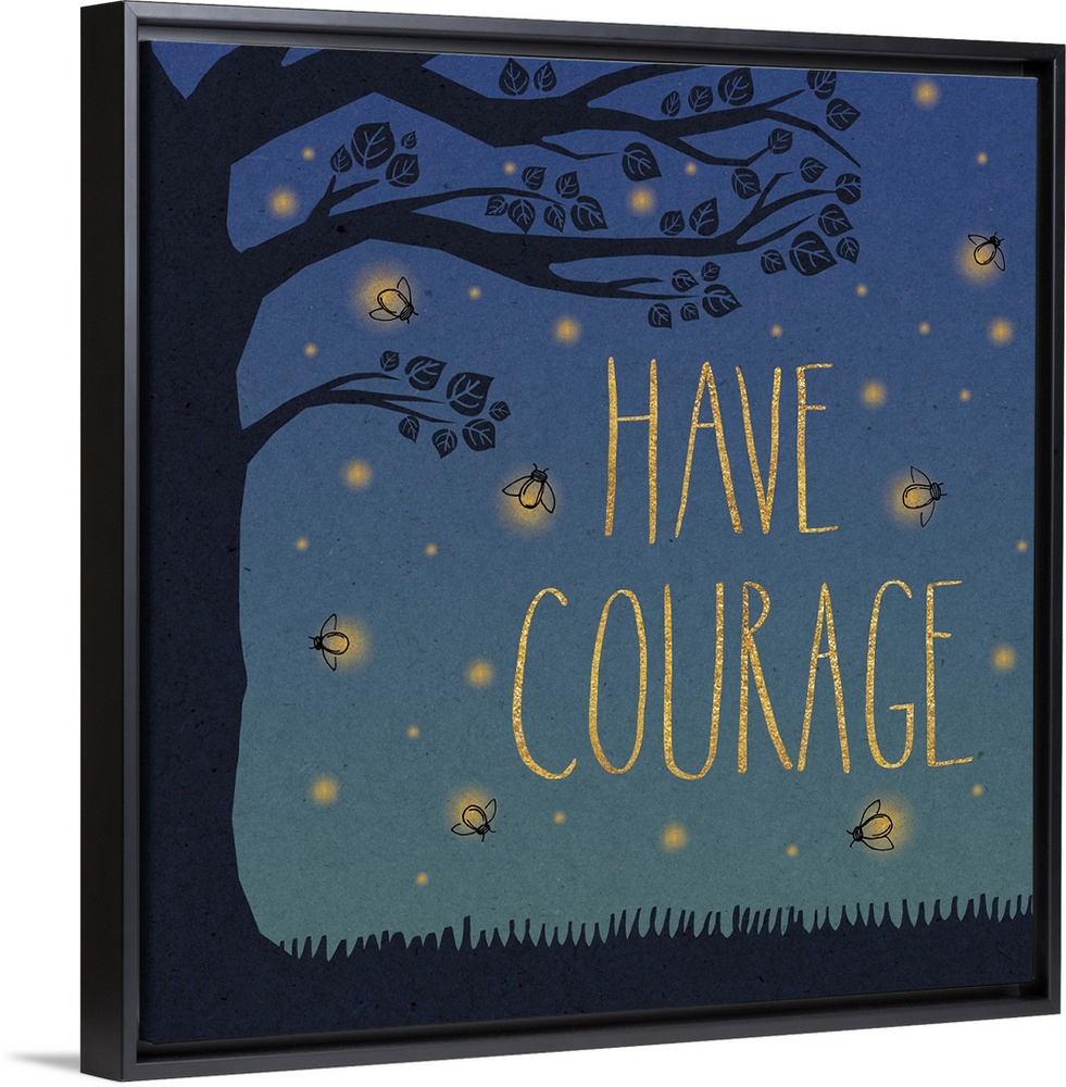 <p>"Have Courage" in yellow letters surrounded by fireflies and a tree silhouette.</p>