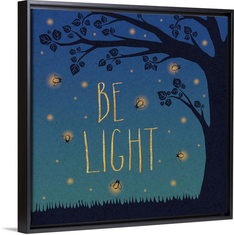 <p>"Be Light" in yellow letters surrounded by fireflies and a tree silhouette.</p>