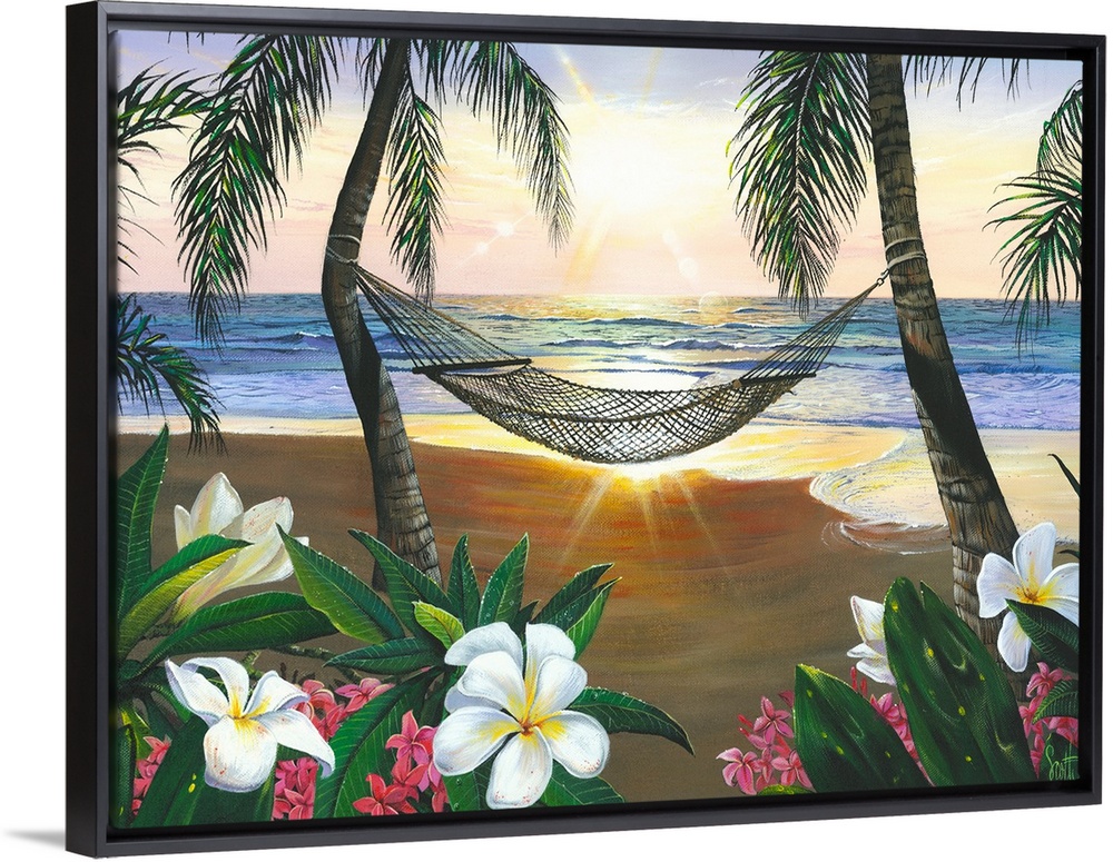<p>This is a landscape painting of plumeria blossoms, a hammock hanging between two palm trees, and the sun setting on the horizon in the background.</p>