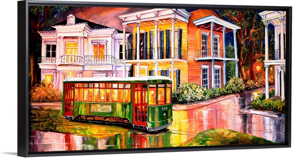 <p>Bright colors are used to paint vintage homes on a street that appears wet as the homes and a trolley reflect in it.</p>