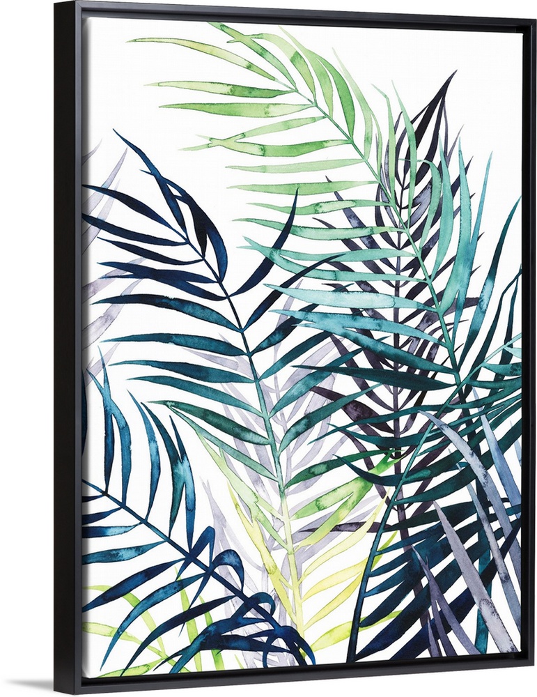 <p>Watercolor tropical leaves in purple, blue and green flutter in the wind over a white background in this contemporary artwork.</p>
