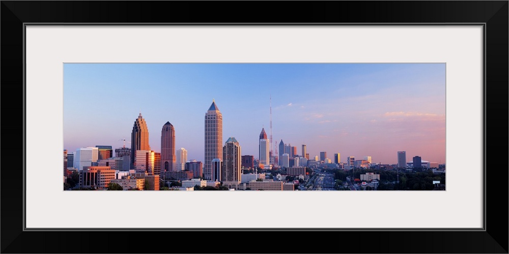 <p>Panoramic photograph of Atlanta skyline at sunset.</p>