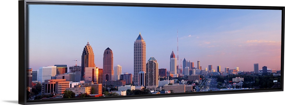 <p>Panoramic photograph of Atlanta skyline at sunset.</p>