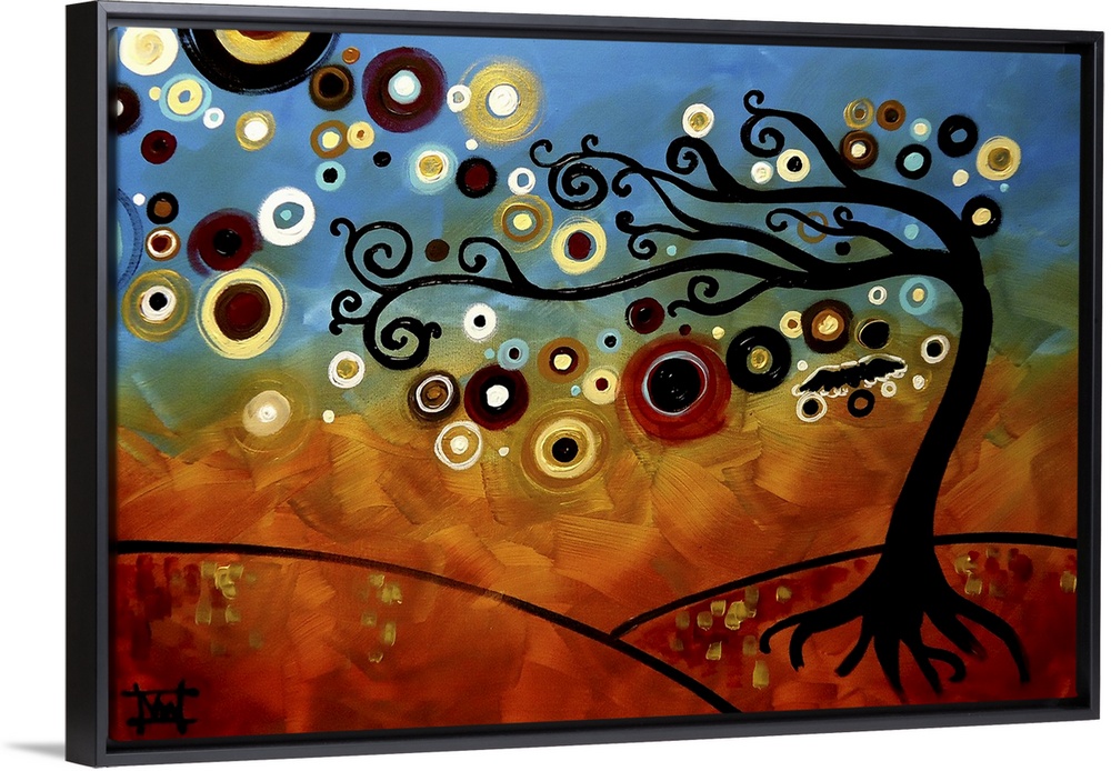 <p>Contemporary painting of a tree with colorful orbs flowing from its branches and a blue and orange background.</p>