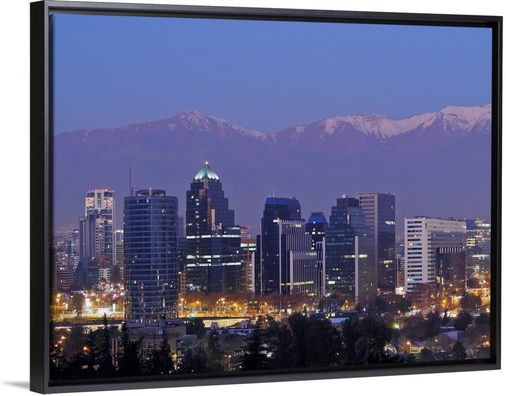 <p>Twilight view from the Parque Metropolitano towards the high rise buildings in the financial sector, and snow covered mountains behind, Santiago, Chile, South America</p>