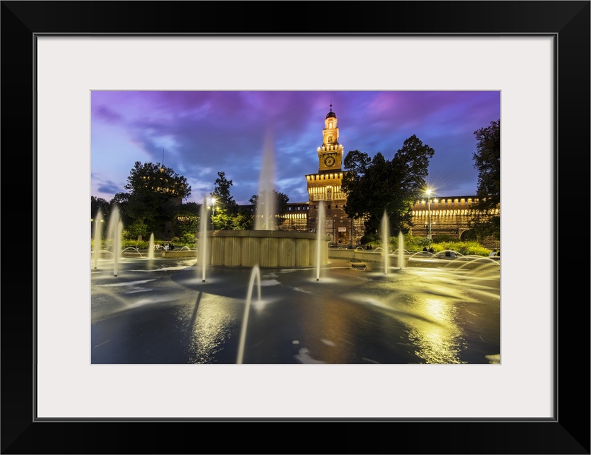 <p>Twilight view of Sforza Castle or Castello Sforzesco and fountain, Milan, Lombardy, Italy.</p>