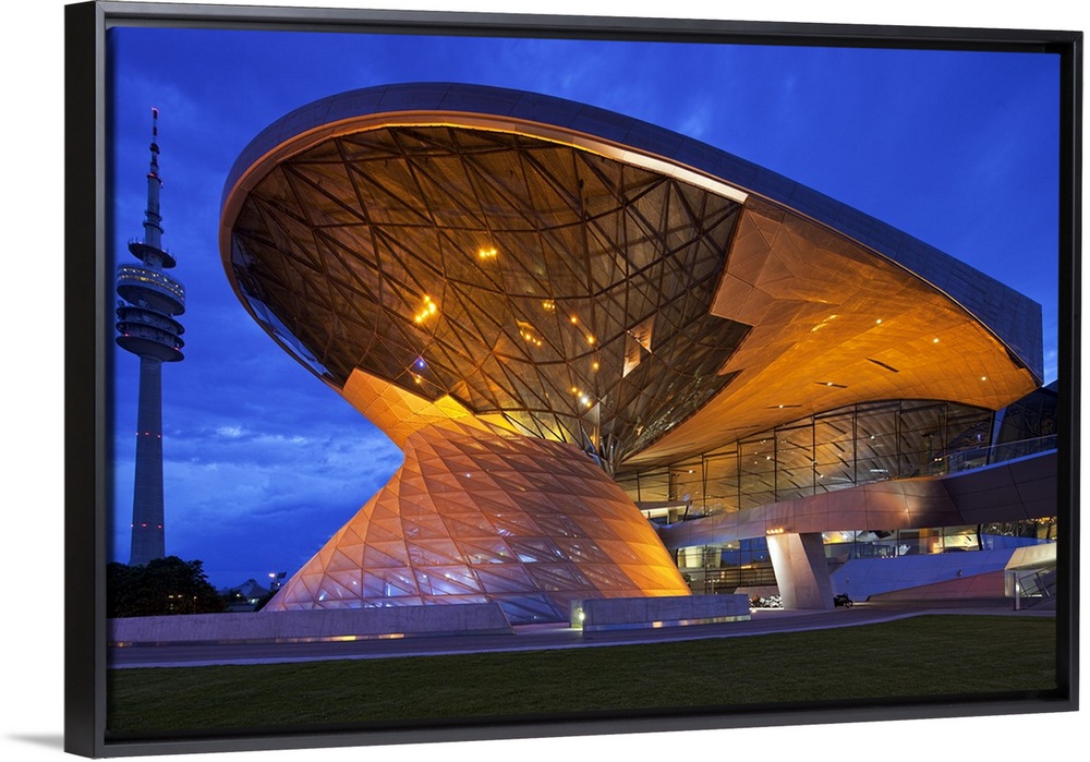 <p>Twilight view of the main entrance to BMW Welt (BMW World) , a multi-functional customer experience and exhibition facility of the BMW Company in Milbertshofen, Munich, Bavaria, Germany.</p>