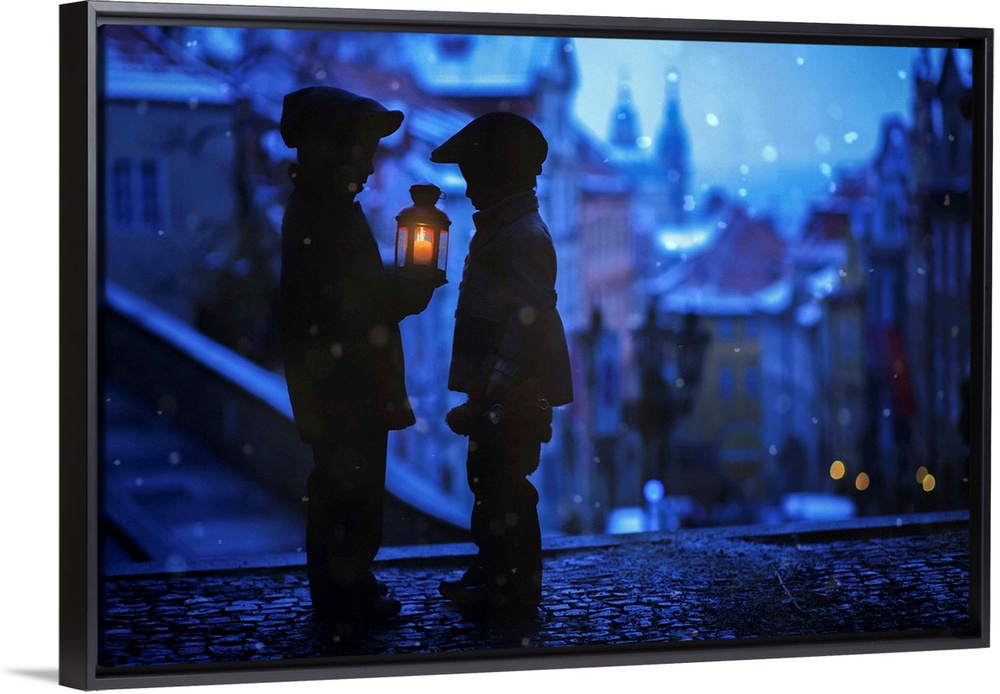 <p>Silhouettes of children facing each other with one holding a lantern at night in winter.</p>