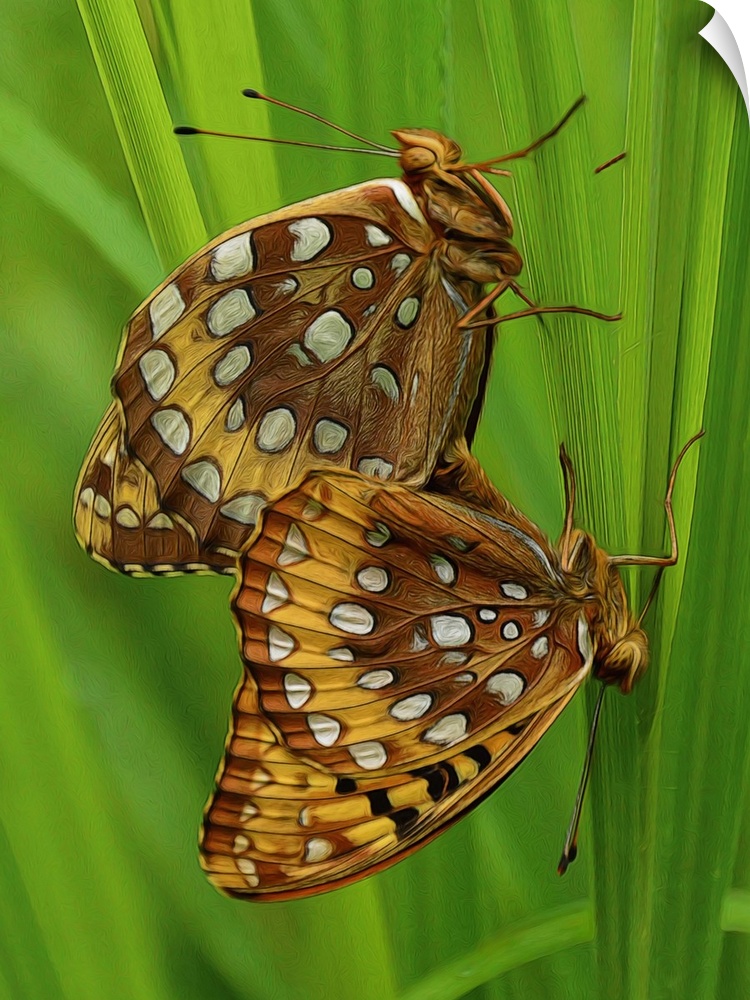 <p>Close-up photograph of two butterfly's clinging to vibrant green grass.</p>