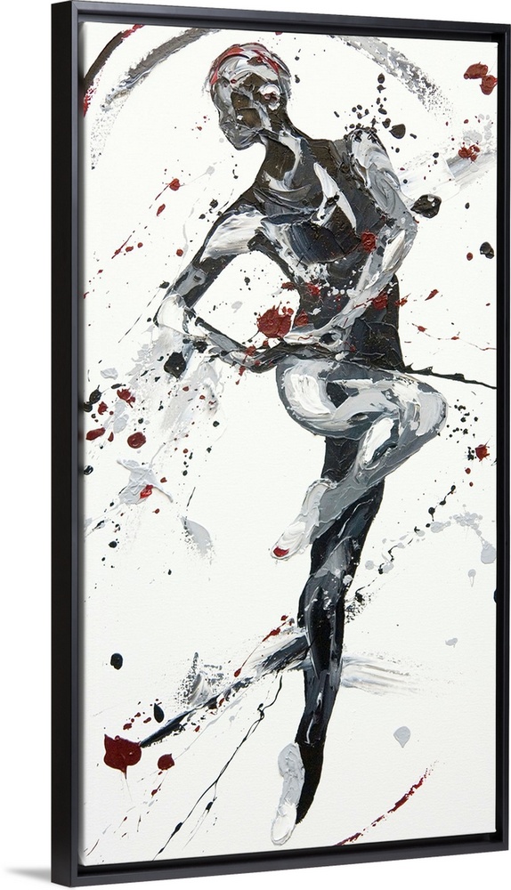 <p>Contemporary painting using black and gray tones to create a dancing figure against a white background.</p>