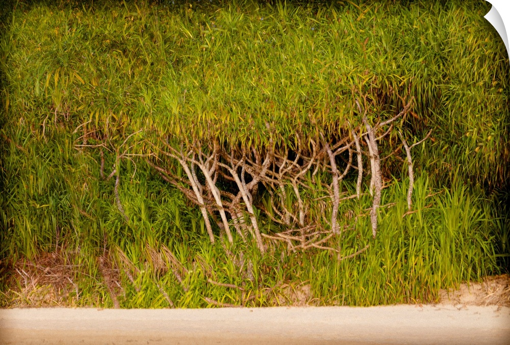 <p>A photo of a palm brush off the beach with intertwining tree trunks.</p>
