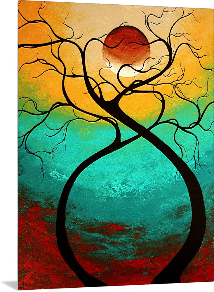 <p>Vertical, large contemporary artwork of two trees curving apart at the base but intertwining at the top in front of a large moon. On a background of transitional colors.</p>
