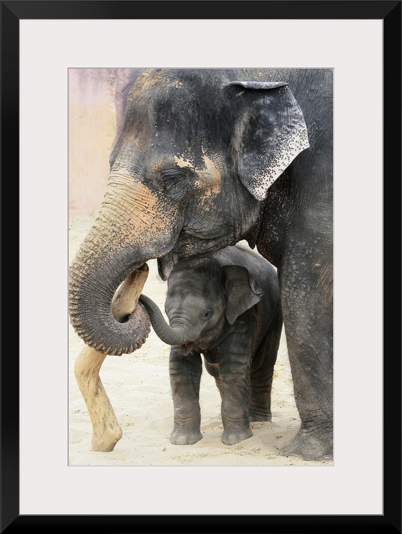 <p>Wildlife photograph of a dirty elephant and its baby playing with a stick in the sand.</p>