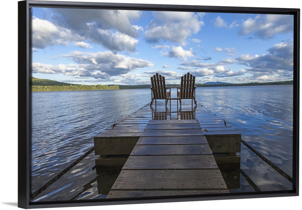 <p>Two adirondack chair on a dock at Spencer Pond in northern Maine.</p>