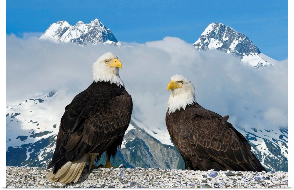 <p>A nature photograph of two birds of prey captured very close up and in front of two enormous snow covered mountain peaks.</p>