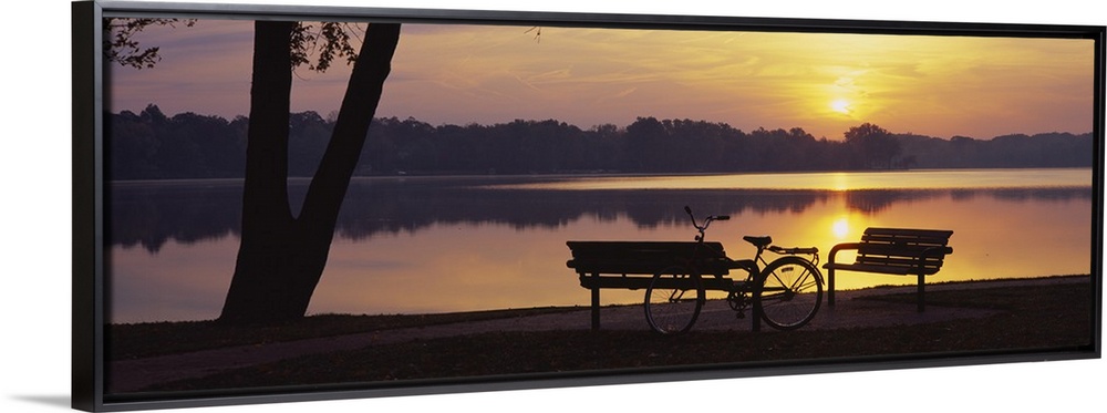 <p>Photograph of bike and park benches near waterfront with forest in the distance. The sun is setting and the forest and sun is reflected in the water.</p>